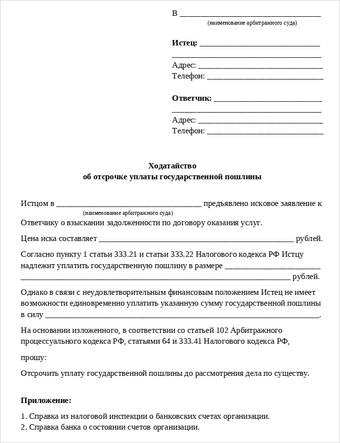 За подачу ходатайства об отсрочке нужно заплатить госпошлину. Ее размер для физических и юридических лиц: