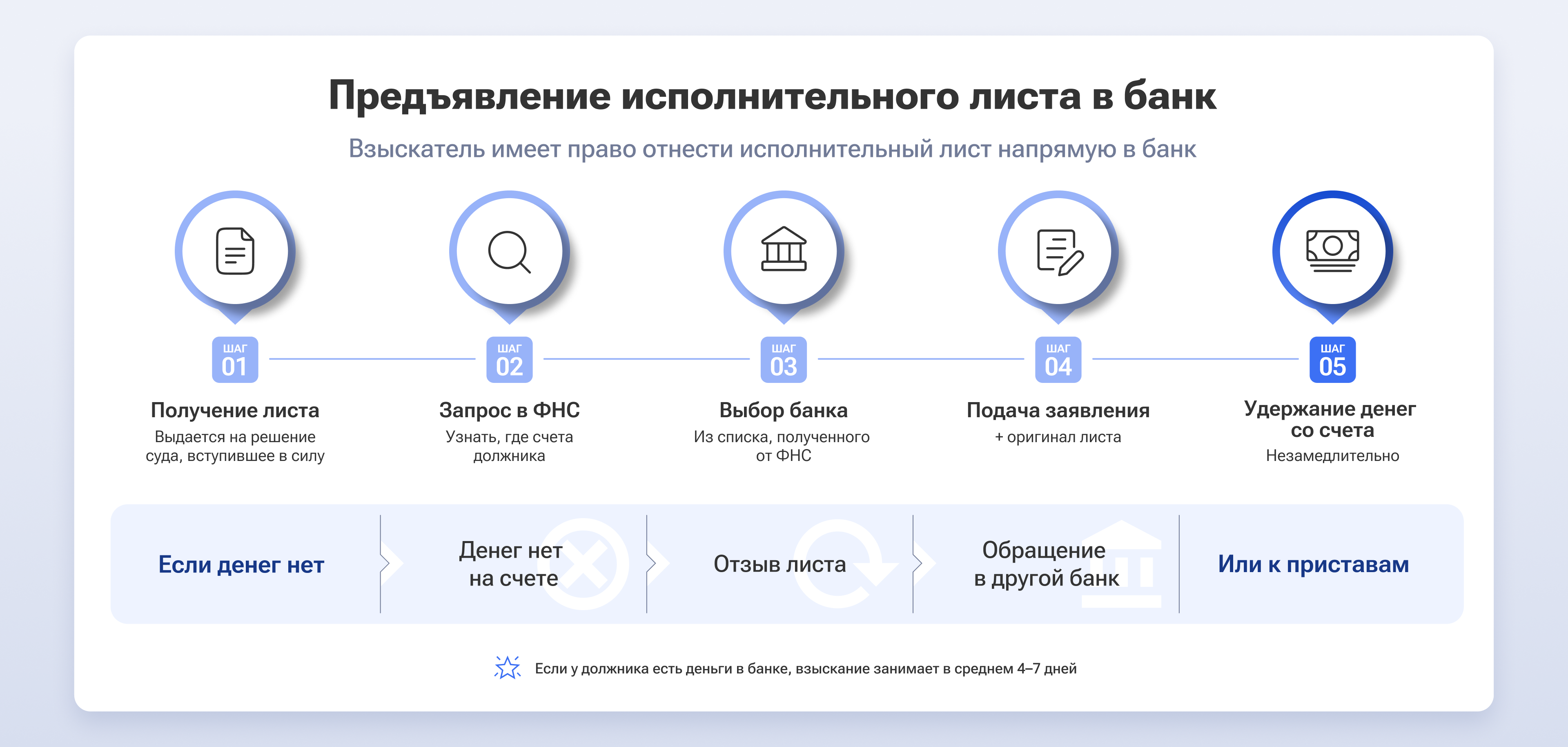 Предъявление исполнительного листа напрямую в банк эффективно, когда взыскатель точно знает, где у должника открыты счета. Тогда взыскание может пройти быстрее, чем при обращении в Федеральную службу судебных приставов (ФССП). Но ключевое здесь — «может», потому что у приставов больше инструментов для взыскания.