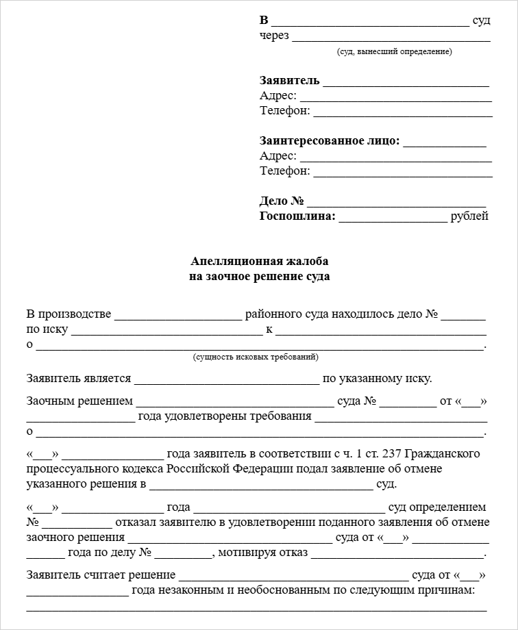 Госпошлина за подачу апелляционной жалобы на заочное решение суда составляет 3 000 рублей согласно п. 19 ч. 1 ст. 333.19 НК РФ. По результатам апелляции решение могут оставить в силе, полностью или частично отменить.
